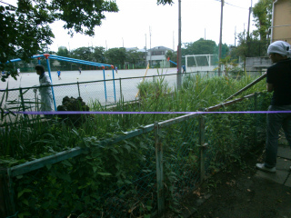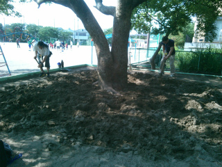 6/14のOPスクール後、記念館前の木登りの木の根がだいぶ出ていたので砂を掘り起こしておきました。