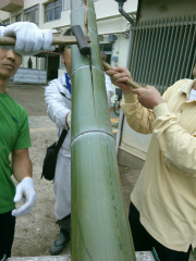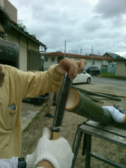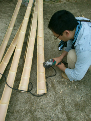 竹の加工。ナタで竹を真っ二つに割いていきます。