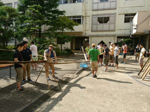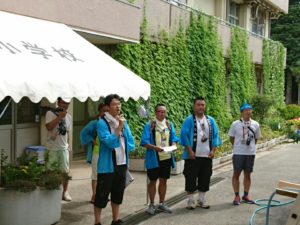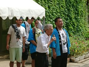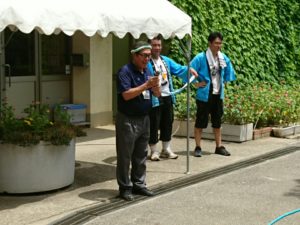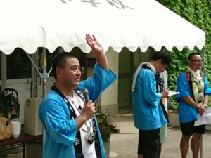 校長先生と そうめん部長の締めのご挨拶を以て、大盛況の流しそうめん大会は終了です。