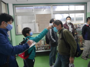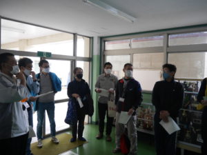 すっかりおなじみの光景になってきましたが、皆マスク着用の上、しっかり検温、消毒を実施します。