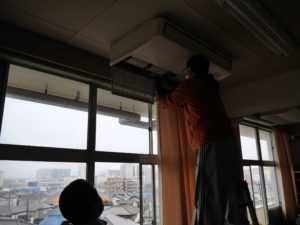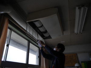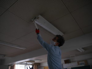 一方、フィルターの水洗いをお願いしている間に、残ったメンバーは、蛍光灯を外して水拭きし、戻していきます。