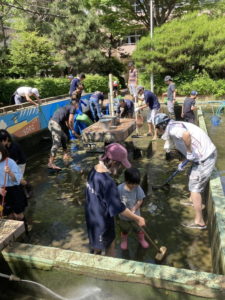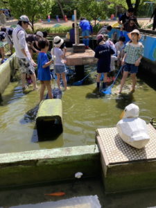 水が抜けてきたら、魚を脇の池に移したり、清掃したりを子供たちと楽しみながら実施します。