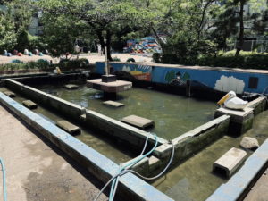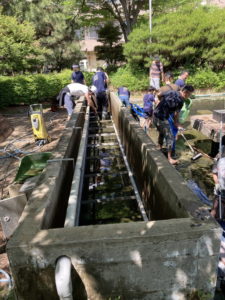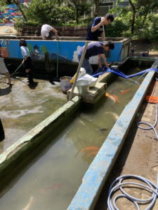 そして、池清掃班は、脇の池の水から抜いて清掃し、その後、脇の池に鯉を移したりしながら清掃を進めていきます。