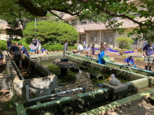 皆さんの協力もあって、無事に清掃終了しました。 例年だと、アオサギ対策で、池に網を張っていたのですが、最近はアオサギの姿も見えないので、もっと児童に池観察を楽しんでもらうために、外してみることにしました。