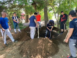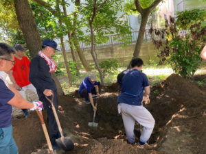 最後は、穴掘り班。 この穴は、池の清掃の時に出た藻などを埋めるために掘っていきます。 ここは、OBの方々を中心に対応いただきます。 (いつもありがとうございます!)